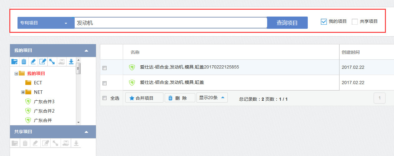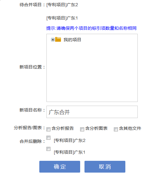 Inspiro提供了两个项目间的合并操作功能,前提条件是两个项目的标引项数量和名称相同,具体操作的时候只需在项目列表中勾选想要合并的两个项目前面的复选框