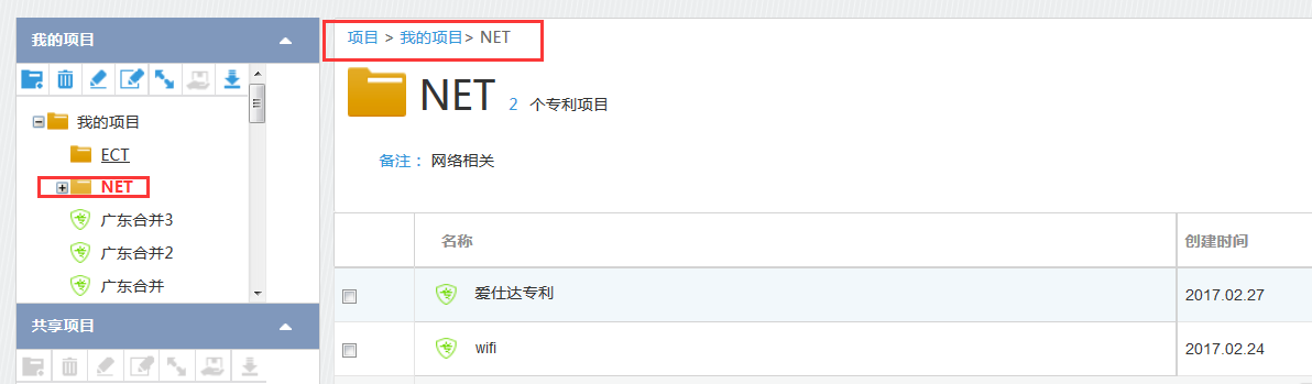 如果想进入某个项目夹,只需在文件夹的目录树中鼠标点击相应的项目夹的名称即可,右侧的项目列表会直接跳转到选择的项目夹页面下,列表的上方会显示当前的项目夹的文件路径。
