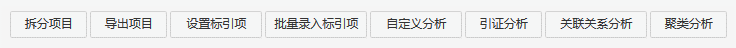 在进入项目概况后可以看到项目概况的底边工具栏包括了拆分项目、导出项目、设置标引项、批量录入标引项、自定义分析、引证分析、关联关系分析和聚类分析这八大功能。
