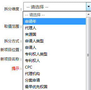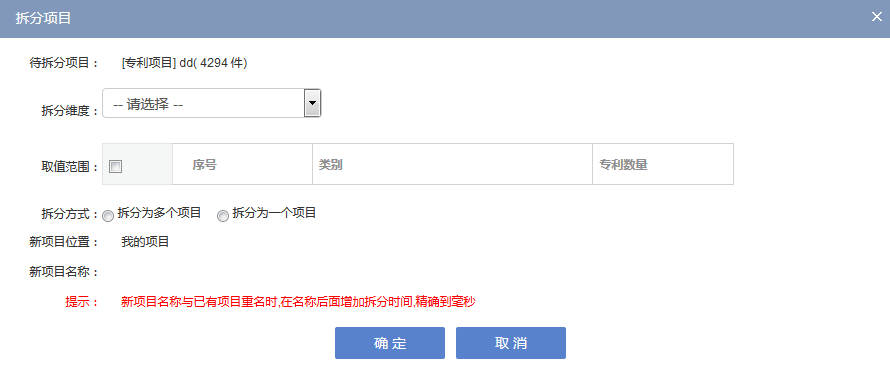 ,选择的数据可以按照拆分方式拆分为一个项目或者多个项目。如果是拆分为多个项目,则生成三个项目,分别包含了2011年、2012年和2013年的专利数据,此时下方会提示