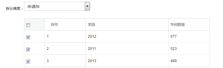 ③选择申请年后会按专利数量将申请年顺序展示在下方的表格中,点击选择需要的复选框