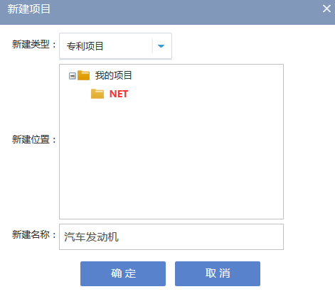 ,在新建位置选择所建的专利项目或项目夹要放置的文件夹,最后在新建名称处给新建的专利项目或项目夹命名,点击