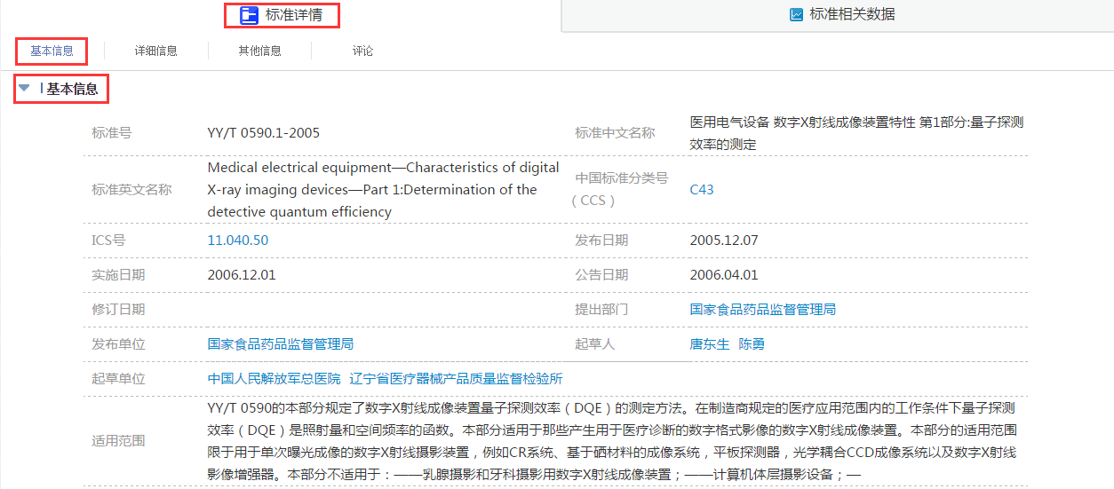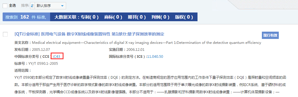 以中国标准分类号字段(中国标准分类号CCS = ( C% ))检索得到的标准——YY/T 0590.1-2005医用电气设备 数字X射线成像装置特性 第1部分:量子探测效率的测定为例,相关数据按照下列检索表达式分别在相应的数据库中检索所得。