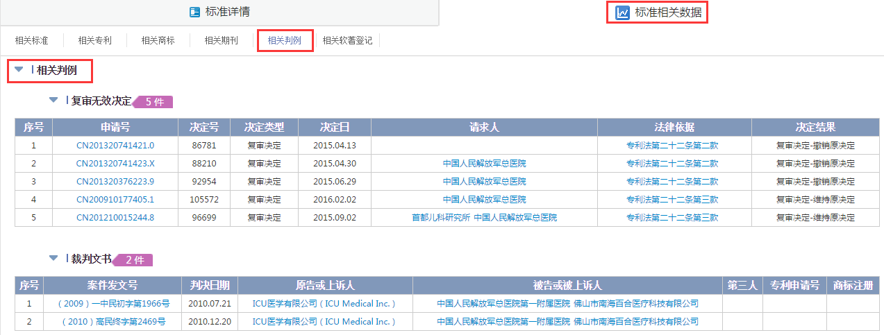 | 判例 | 复审无效决定 | APC,APO,APE,ASO,ASE,ASC,ASPO,ASPE,ASPC+=('中国人民解放军总医院' OR '辽宁省医疗器械产品质量监督检验所') | 5 |