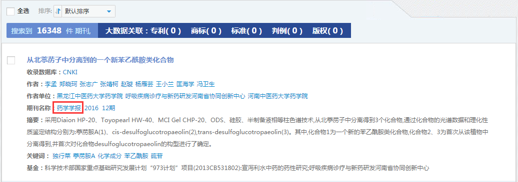 以期刊名称药学学报为例,检索表达式为文献来源原文 = '药学学报',检索结果如下图所示。