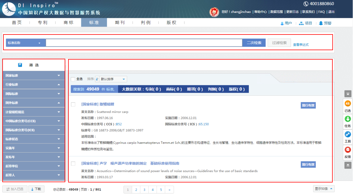 或检索历史中的结果数,跳转至标准概览页面,标准概览页面可分为检索区、筛选区、阅览区和工具栏4个部分。