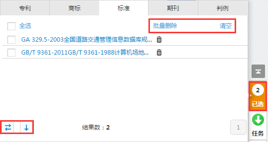 右侧工具栏包括已选、任务、工具及反馈。在“已选-标准”项下,用户可对加入已选的标准进行对比分析、下载及删除。
