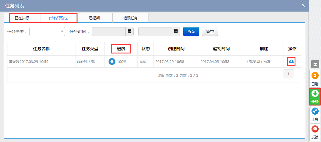 提交的下载任务可在“任务-正在执行”项下查看下载进度,已完成的任务需点击