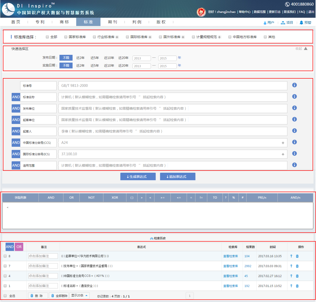 ,即可进入标准检索页面,标准检索页面从上至下依次为标准库选择区、快速选择区、表格检索区、表达式编辑区和检索历史显示区。