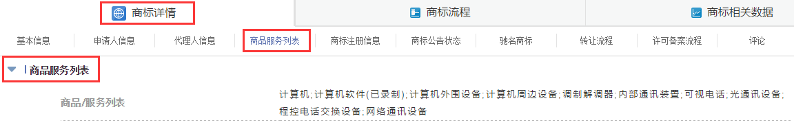 点击商标名称或申请号,即可进入该商标的细览页面。