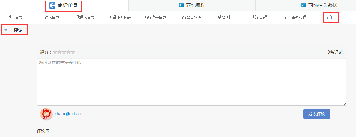 商标详情页面提供商标的基本信息、申请人信息、代理人信息、商品服务列表、商标注册信息、商标公告状态、驰名商标、转让流程及许可备案状态,点击页面上部商标详情列表即可滑动至相应位置。用户还可对该商标发表评论。