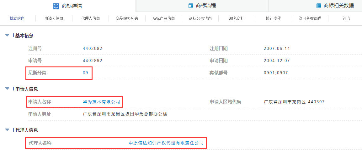 点击详情页面中的蓝色字体,系统将以检索表达式 尼斯分类 = '09' 、代理人名称 = '中原信达创知识产权代理有限公司'、 申请人名称 = '华为技术有限公司' 进行检索,并打开一个新的商标概览页面。
