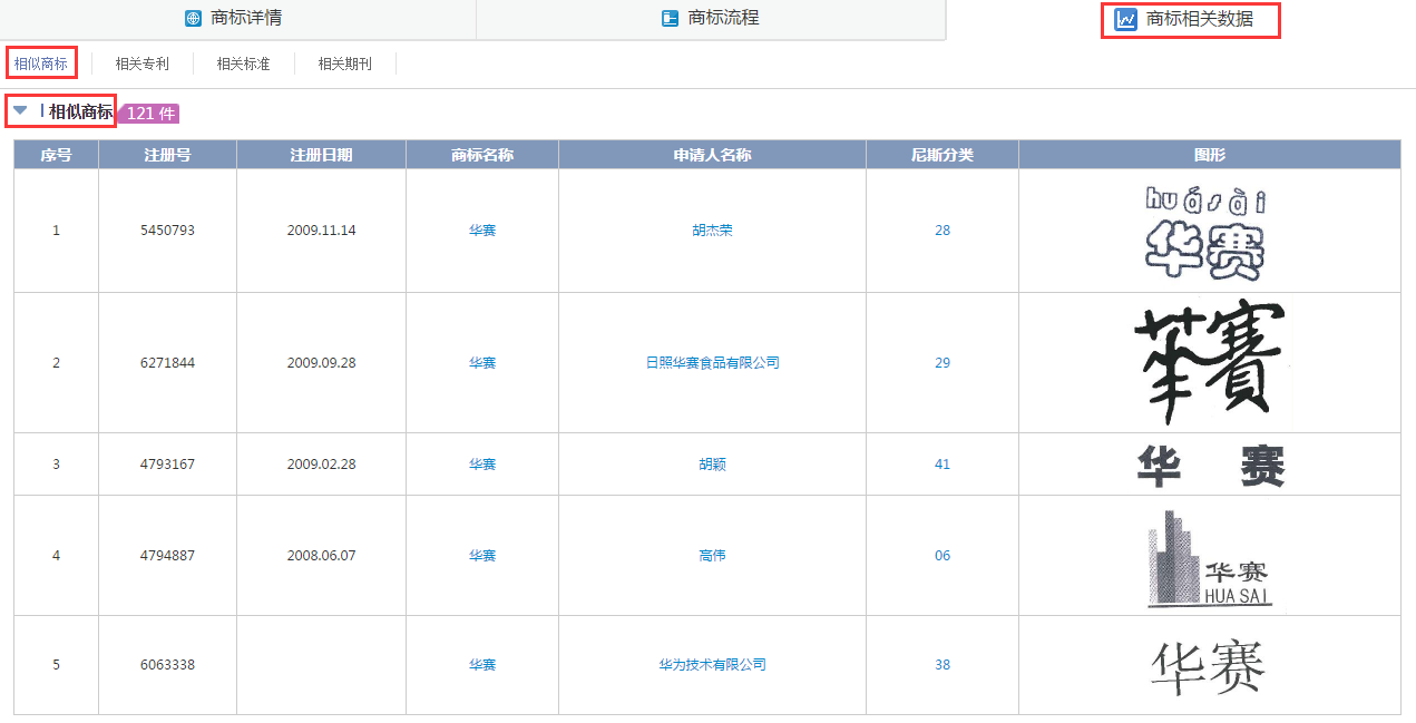 | 中国商标数据库 | (SS='华赛') 近似检索 | 121 |