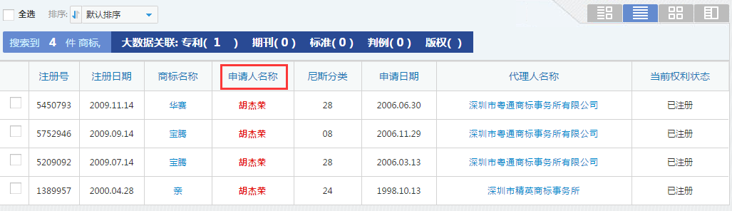 点击商标、专利、期刊、标准名称,进入相应数据的细览页面;点击其他蓝色字体,系统以相应的检索式进行重新检索,检索结果显示在新的页面中,以申请人胡杰荣为例,检索表达式为( 申请人名称 = '胡杰荣' ) ,检索结果如下图所示。